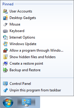 Right-click a program or even a program shortcut in Windows 7 and "Pin to taskbar" appears on a pop-up menu. Simple. Drag a file you created with that pinned program to the taskbar, and your work pins to the program's right-click jump list. Simple. Open a file, right-click its taskbar icon, and pin away. Simple. Then there's Control Panel.
